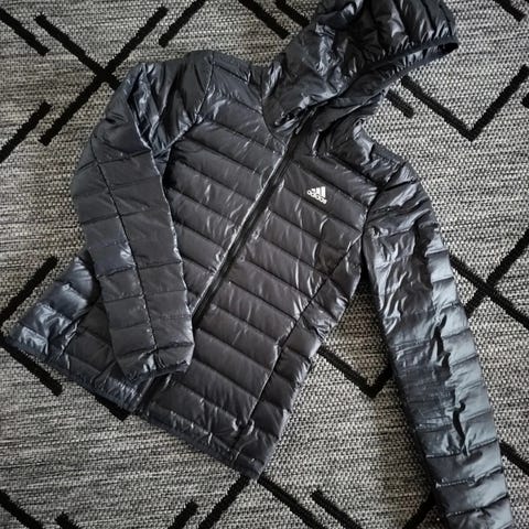 Adidas musta takki, koko S, valmistettu polyesteristä. Takki on tarkoitettu miehille ja soveltuu ulkokäyttöön.