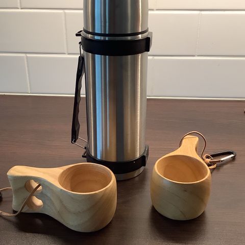 Pienet kuksat ja termospullo avaamattomassa puisessa lahjapaketissa.