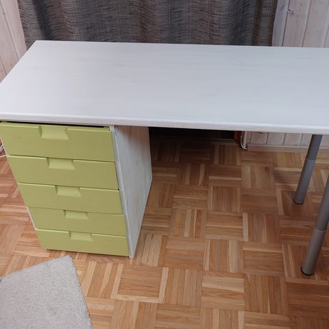 Martela työpöytä+ kaksi laatikostoa. Kunto ok, pientä käytön jälkeä. Korkeus säädettävissä.