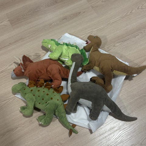 IKEA lasten lelut, dinosaurusaiheiset pehmolelut. Setti sisältää useita erilaisia dinosauruksia eri väreissä ja kokoisina. Soveltuvat lasten leikkeihin.