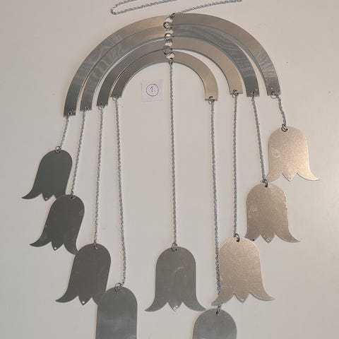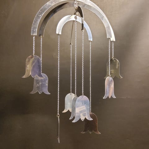Aarikan tulppaaniaiheinen mobiili Morsiuskello 1980-luvulta. Kokonaiskorkeus n. 91 cm.