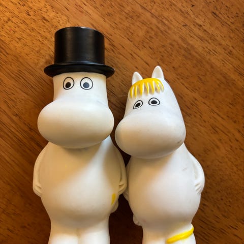 Muumi-hahmot lelu, kaksi erilaista hahmoa, Muumipeikko ja Niiskuneiti, muovimateriaalia. Sopii lasten leikkeihin ja keräilyyn.