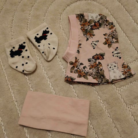 Ammattiompelijan tekemä setti Baby Born nukelle. Settiin kuuluu paita/tunika & legginssit. Selässä vetoketju, joten lapsen on helppo pukea nämä nukelle. Ehkä paristi nuken päällä olleet, mutta huomasin muutaman pistetahran. Tahroja lukuunottamatta uudenveroisessa kunnossa. Savuton, lemmikitön & hajusteeton talous.