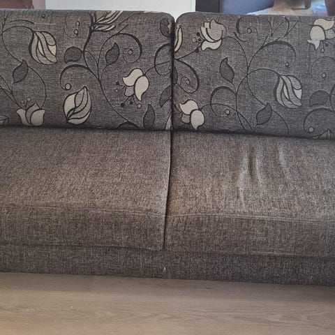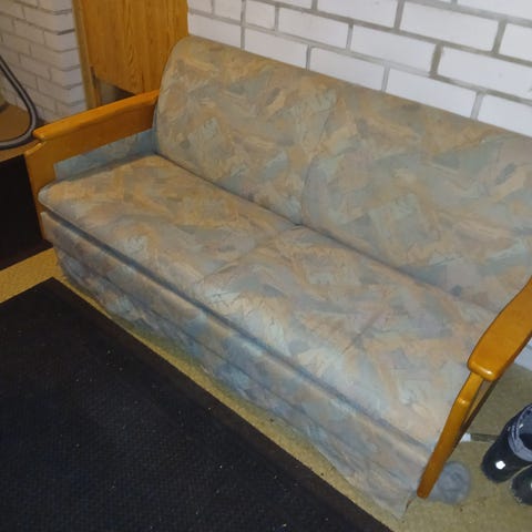 Puurunkoinen, jämäkkä sohva. Punainen plyysikangas.
