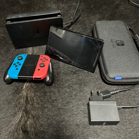 Nintendo Switch OLED -pelikonsoli valkoisilla ohjaimilla. Mukana konsolin telakka, virtalähde, kantokotelo, ohjainpidikkeet ja rannekkeet. Käyttökelpoinen pelikonsoli, jossa OLED-näyttö ja irrotettavat ohjaimet.