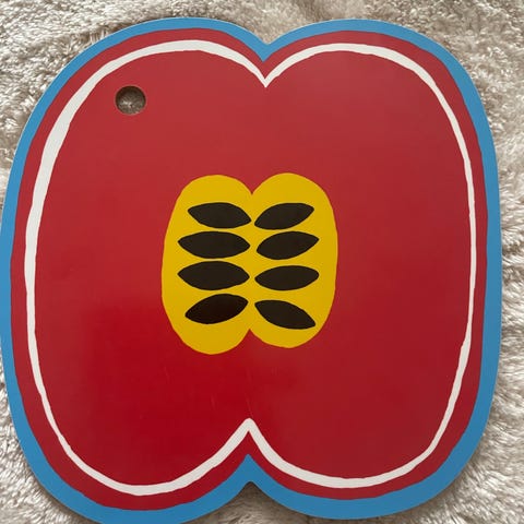 Tätä Marimekon leikkuulautaa koristaa Maija Louekarin suunnittelema leikkisä ja ihastuttava Puutarhurin parhaat -kuosi, joka tuo sadonkorjuuherkut osaksi keittiötä. Se on täydellinen keittiötarvike ja samalla tyylikäs sisustusyksityiskohta.Puutarhurin parhaat -leikkuulauta on valmistettu kovasta puukuitulevystä (HDF-levystä), ja sen koko on 19,5 x 29,5 senttimetriä. Kulmassa on reikä, josta sen saa kätevästi roikkumaan. Suositellaan käsinpesua.