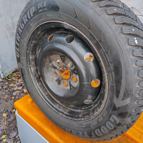Neonista jääneet talvirenkaat.