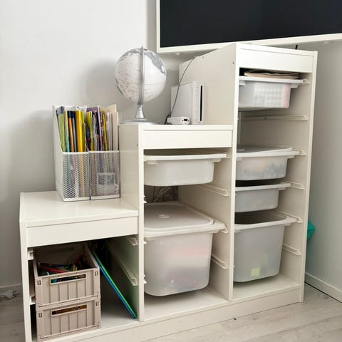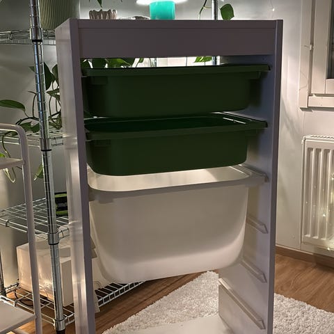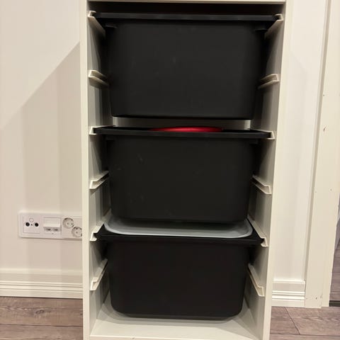Ikean trofast hylly kolmella vaaleanpunaisella laatikolla.