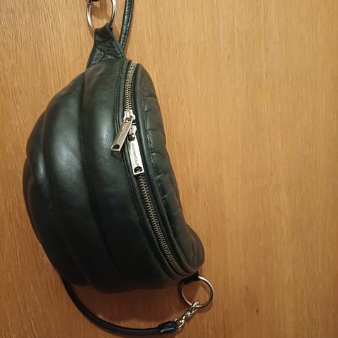 Marimekon Elfvina-olkalaukku, nahkaa. Musta väri ja säädettävä olkahihna. Metallinen lukitusmekanismi. Sopii moneen käyttöön.