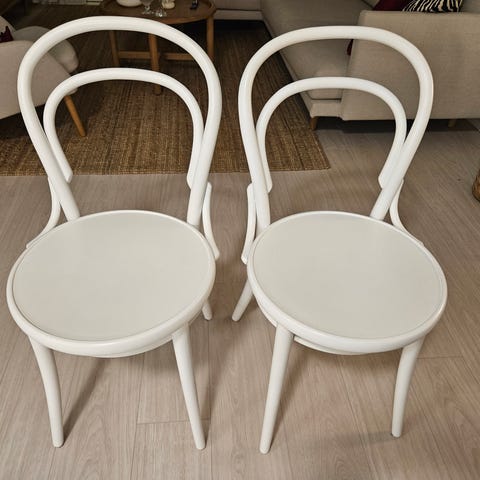 Michael Thonetin suunnittelemat TON no. 14 tuolit. Väri valkoinen. Ostettu vuonna 2025, valmistettu 2024. Siistikuntoisia, joitain pieniä käytönjälkiä varmaan löytyy. Hinta kahdelle tuolille yht. 400 euroa.
