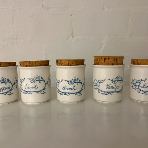 Arabia keittiöastiasetti, joka sisältää mustat maustepurkit ja tarjoilualustan. Setti soveltuu mausteiden säilytykseen ja tarjoiluun keittiössä. Teak-alusta kohtalaisessa kunnossa. Yhteishinta.