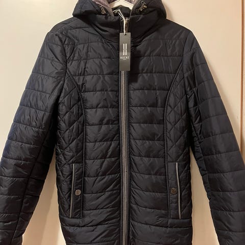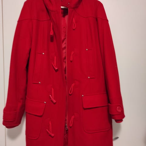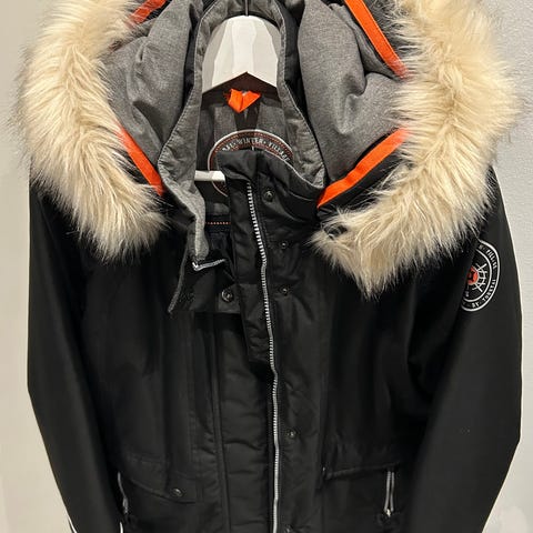 Materiaalina 80% villaa ja 20% polyamidia. Huppu ja turkis hupunreunassa. Tumman sininen väriltään, koko 40. Nouto tai postitus.