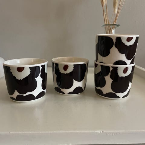 Marimekko Unikko kahvikupit, kuusi kappaletta. Kupit ovat mustavalkoisella unikko kukkakuviolla