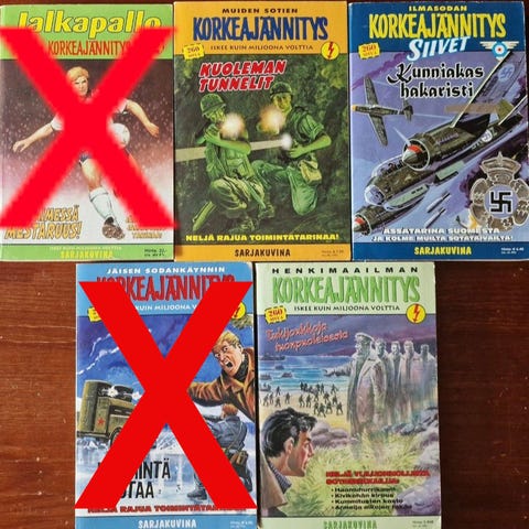 Myyn paljon korkeajännitys-pokkareita 3 euron kappalehintaan. Alle on listattu kaikki myynnissä olevat pokkarit: