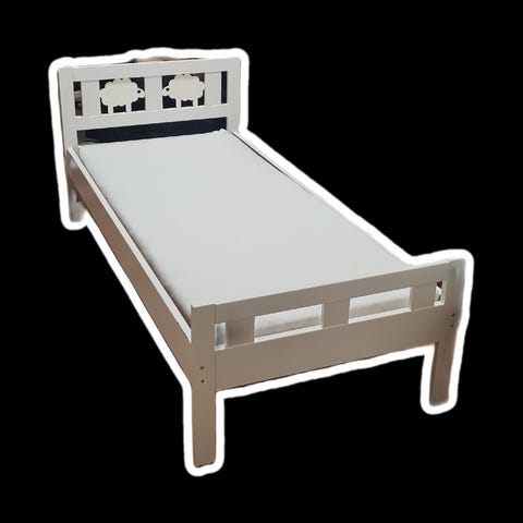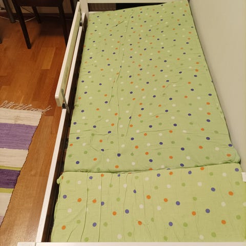 IKEA Kritter lastensänky ja mukaan myös Ikean pohjasäleikkö ja sivutuki tai koroke. Kunto on ihan ok, eli on ihan ehjä mutta kulumaa ja päädyssä on pintaa maalattu (ks kuva). Myös petauspatja. On siisti ja pesty. Meillä on myös varsinainen joustinpatja tähän sänkyyn mutta tyttö ajatteli pitää sen. Mutta jos myös se kiinnostaa niin ehkä 10 eur olisi hinta sille. Meillä ei ole kotieläimiä. https://www.ikea.com/fi/fi/p/kritter-saengynrunko-ja-saelepohja-valkoinen-s69185435/