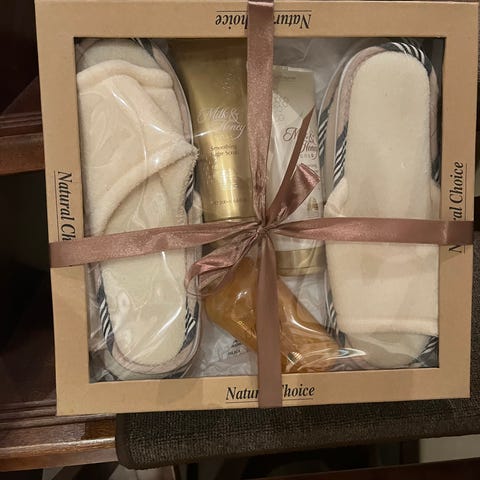 Natural Choice kylpytuotesetti sisältää luonnonvärisiä kylpytuotteita. Sisältää 2x Tossut, 4 xkylpykinnas (kahta erilaista).