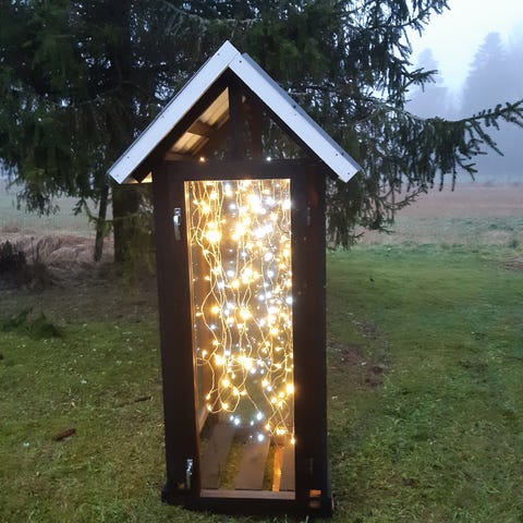 Koristeellinen lyhty, jossa metallirunko ja lasipinnat. Sisällä on koristeelliset valoketjut, jotka luovat valomalleja ympäristöön. Sopii sisätiloihin tunnelmavalaistukseen.Runko puuta, räystäs avoin tuuletusta varten. Konstsmide valoketju sisältyy hintaan.Korkeus 37 cm, leveys 23 cm, pituus 35 cm.