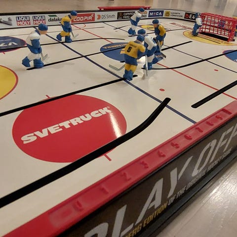 Annetaan Stigan pöytälätkäpeli. Kaikki osat tallella. Kaksi kiekkoa. Toimiva.