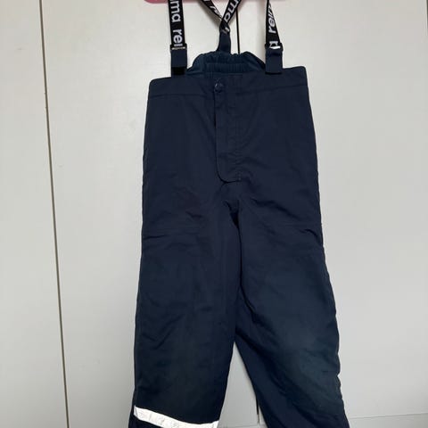 Koko 122. Tumman sininen toppapuku. Takki Kappahl ja housut H&M lähes samaa sävyä siniset. Pientä käytön jälkeä. Siistit ja ehjät. Toinen lahkeen remmi puuttuu. Kärjessä seinäjoella