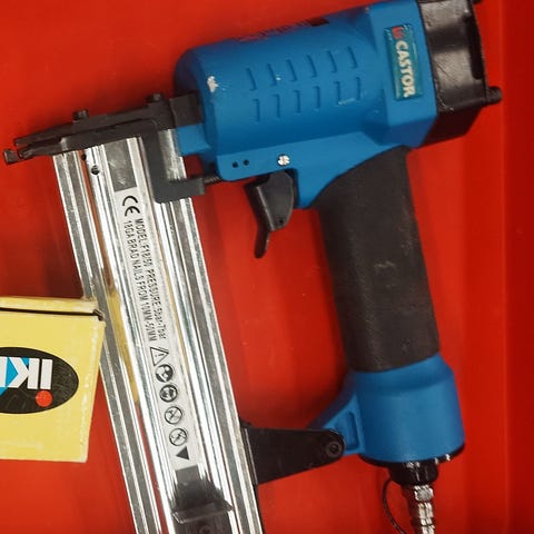Paineilmakäyttöinen Castor-naulain (2-in-1: dyckertnaulain ja kapea hakasnaulain). Sopii erinomaisesti viimeistelytöihin, listoittamiseen, huonekaluihin, verhoiluun ym.