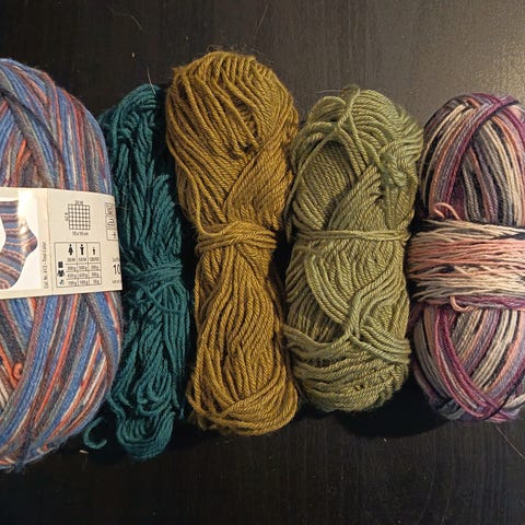 Setti villasekoite lankoja. Yhteensä 180g. Ovat kaikki hieman paksumpia lankoja, neulottavissa 4-4,5mm puikoilla/koukulla.