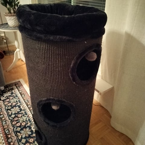 Beige värinen kissan raapimispuu, jossa useita tasoja ja leluja. Materiaali pääasiassa pehmeä ja kestävä, sopii kissojen kiipeilyyn ja leikkiin.