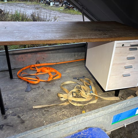 Tukeva ja vakaa työpöytä. 4 jalkaa lukittavilla rullilla ja kork säädettävin jaloin. Maali kulunut, alla lakka. Voidaan myydä myös kunnostettuna.