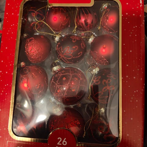 Ihanat, söpöt, käyttämättömät joulukuusen pallot. Miks ei vaikka muuhunkin käyttöön. Pallon molemmin puolin on aina sama kuvio. Eli jokainen pallo on eri kuvalla. Sakset ja kynä ovat pitämässä pallot paikoillaan mutta antavat myös mittasuhteet. Hinta yhteensä kaikille neljälle.