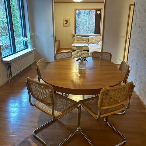 Myydään massiivipuinen pyöreä pöytä, jossa jatkopala mukana. Todella tukeva. Tuolit saa helposti sijoiteltua pöydän ympärille, koska pöydässä on yksi keskijalka.