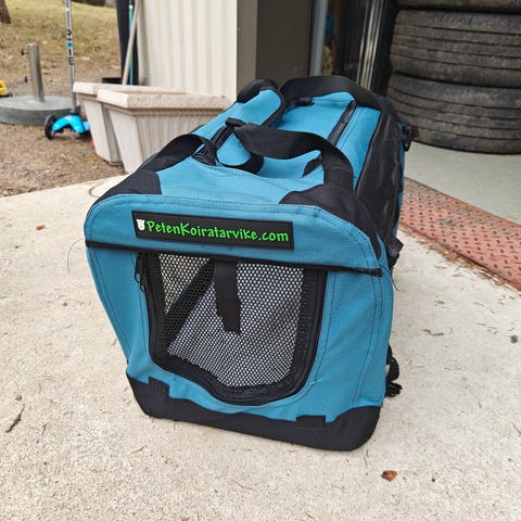 Kannettava pehmeä koirankuljetuskassi, joka on väriltään beige ja musta. Kassi on valmistettu kestävästä materiaalista ja siinä on useita verkkopaneeleita ilmanvaihtoa varten. Kassin mukana tulee pehmeä alusta ja ulkopuolella on tasku lisätarvikkeille. Sopii pienten lemmikkien kuljetukseen.
