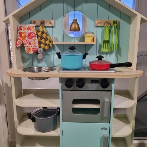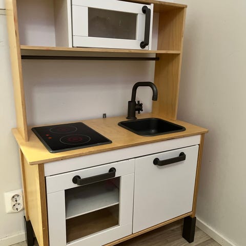 Lasten keittiö leikkikalukeittiö sisältää uunin, liedet, tiskialtaan, mikroaaltouunin ja kahvinkeittimen. Keittiössä on useita säilytystiloja ja tarvikkeita, jotka sopivat lasten leikkeihin ja roolileikkeihin.