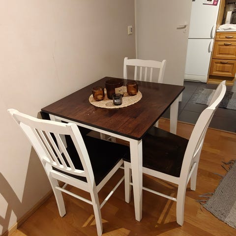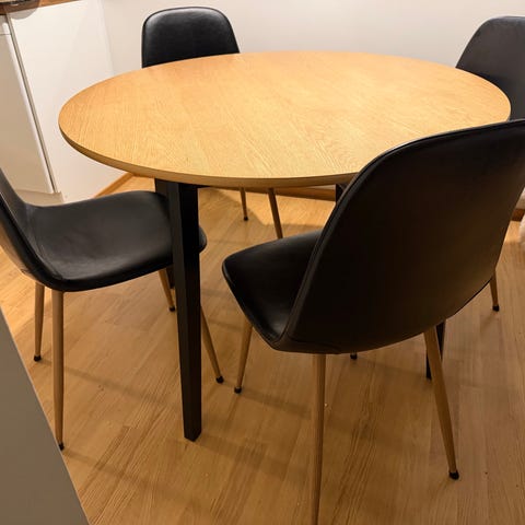 Kuvan jysk jegind ruokailuryhmä. Pöydän halkaisija 105cm ja korkeus 75cm. Siistissä kunnossa, joitakin pieniä jälkiä pöydän ja tuolin jaloissa. Kälviällä.