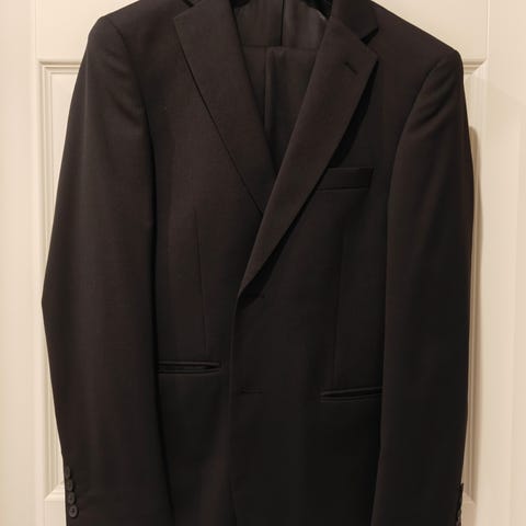 Kerran käytetty puku ja kunto kuin uusi. Takin koko 50 ja housujen 33/32. Olen itse 185cm ja 80kg ja puku on sopinut mainiosti.