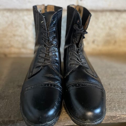 Käytetyt nahkaiset ratsastus kengät turvakärjellä. Kärjistä nahka kärsinyt, mutta ajavat asian.