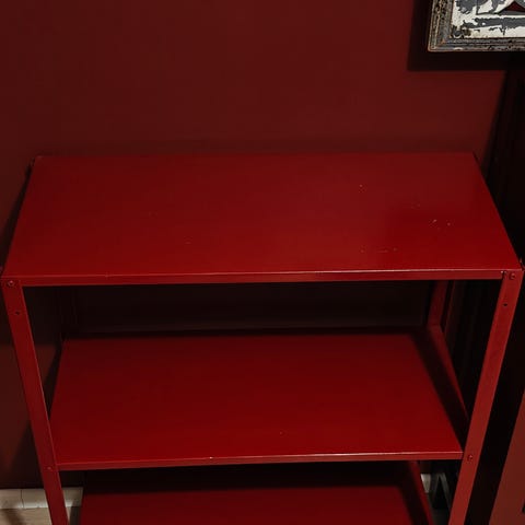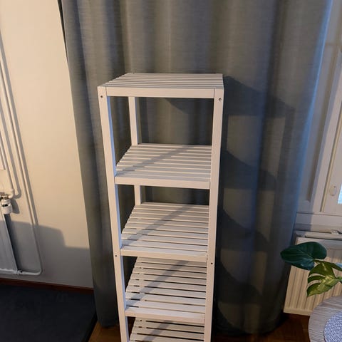 Myynnissä nopealla aikataululla tämä hyllykkö. Muuten siisti, mutta yhdestä kohtaa sisältä vähän repsottaa reuna.