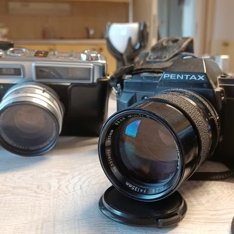 Annetaan kaksi vanhaa kameraa, ei tietoa toimivuudesta. Pentax SF7 filmijärjestelmäkamera laukkuineen ja Agfa laatikkokamera. Pentax siistissä kunnossa. Agfa ollut ulkovarastossa säilössä joten on lähinnä koristeeksi.