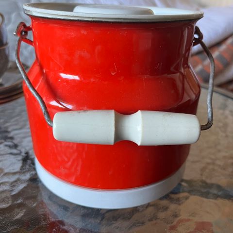 Kellertävä vintage emalikannu, jossa on vihreä kahva. Kannu on valmistettu metallista ja siinä on kaareva muotoilu, joka tuo esiin sen vanhan ajan viehätyksen, pinta emaloitu. Sisäpuolella on havaittavissa käytön jälkiä ja tummentumia, jotka kertovat sen historiasta.