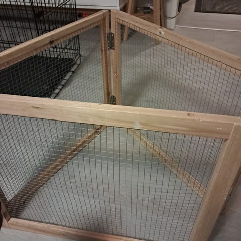 Piensilmäisestä teräsverkosta tehty aitaus. Marsut, kanit, pienet koirat kaikki mitkä ei tuosta yli hyppää. Mitat noin 2.7x 2.7x1.0 m sekä ovielementti. Helppo kasata ja purkaa. Tappi holkki liitokset joten voit venytellä mihin muotoon hyvänsä.