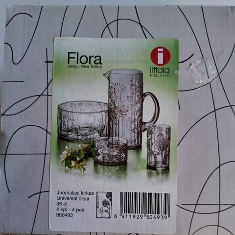 Oiva Toikan suunnitteleman Flora sarjan juomalasit. Laseja on käytetty vain muutaman kerran. Ne ovat uuden veroiset.