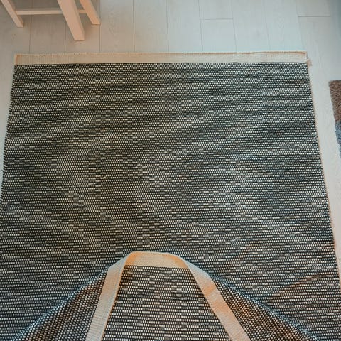 Mustavalkoinen Annon villamatto. Pesty ja nyt ollut jonkun aikaa säilytyksessä. Toinen puoli mustalla pohjalla luonnonvaaleaa raitaa. Muutama moite maton kuteessa. Niistä kuvia.