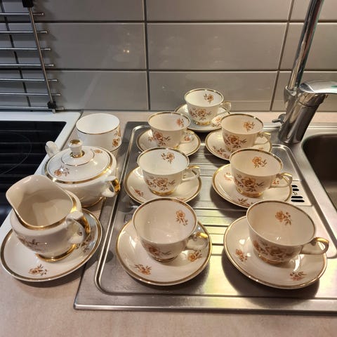 Viisi kuppia, neljä asettia ja kuusi pullalautasta sekä sokerikko. Ehjiä, mutta käyttökulumaa mm kultaukset hiukan haalistuneet. Piippuleima. Koko setti yhteensä 40 euroa. Nouto, tai kuljetan jouluviikolla mukanani Jkl-Raisio välillä