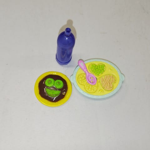 Muovinen setti. Lautanen, lusikka, haarukka, nokkamuki, 3 tuttipulloa. (Pinkkikorkkisen tuttipullon kyljessä halkeama ja v.punkorkkisen päässä kulumaa, ks.kuva)