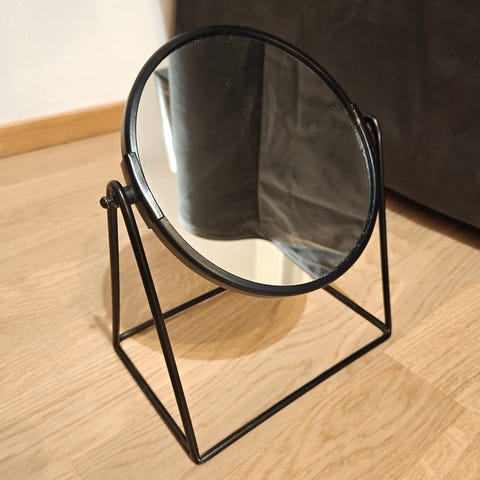 Pyöreä pöytäpeili mustalla metallijalustalla