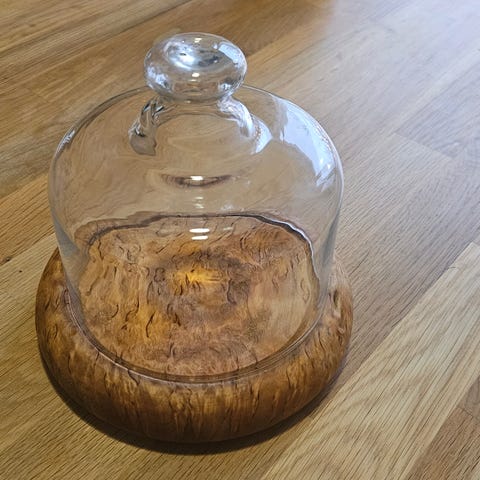 Iso-Pahkalan valmistama keraaminen juustokupu. Voi laittaa myös esim. Voin tarjolle. Aluslautasen halkaisija 19,5 cm kuvun korkeus noin 7 cm ja kuvun suun halkaisija noin 14,5 cm