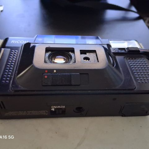 Ricoh kamerakamera, musta ja hopeanvärinen runko, perinteinen filmikamera. Sopii valokuvaukseen ja keräilyyn.
