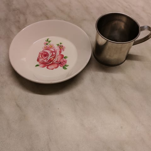 astiat 44. Lilasinikukkainen vanha posliinimuki