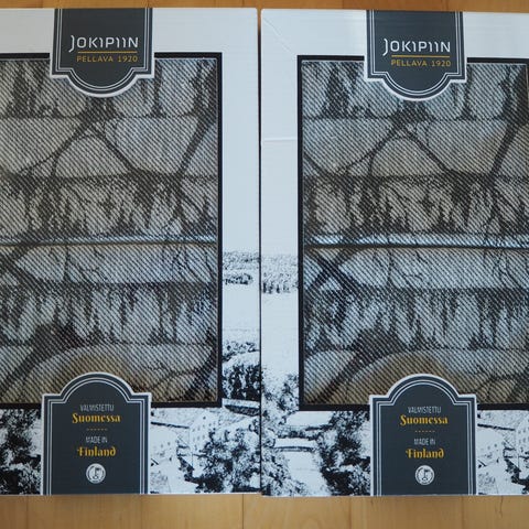 Laadukkaat Jokipiin Pellavan Tuuli pefletit (2) lahjapakkauksessa. Pefletin koko 45x55. Materiaali 50% pellava, 50% puuvilla. Laatikon vasemmassa yläreunassa pieni Carmoliksen mainostarra.