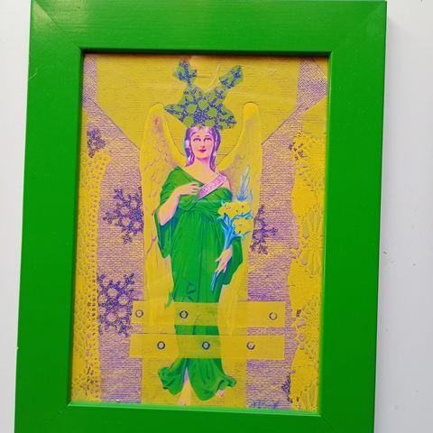 Huopaenkeli-taulu, enkeli huovutustyönä. Mitat 32x22 cm.