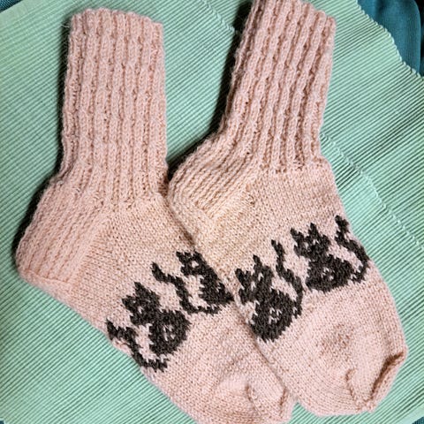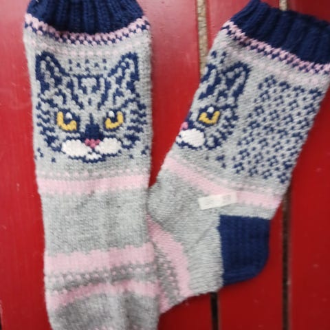 Sukat kudottu käsin nalle-langasta. Vahvistettu kantapää. Koko 37-39.