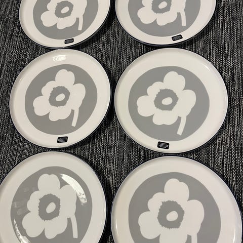 Myydään 3kpl Marimekon Unikko lautasia, joiden halkaisija on 25cm. Lautaset ovat hyvässä kunnossa, mutta normaalia kulumaa niissä näkyy (kuvassa).